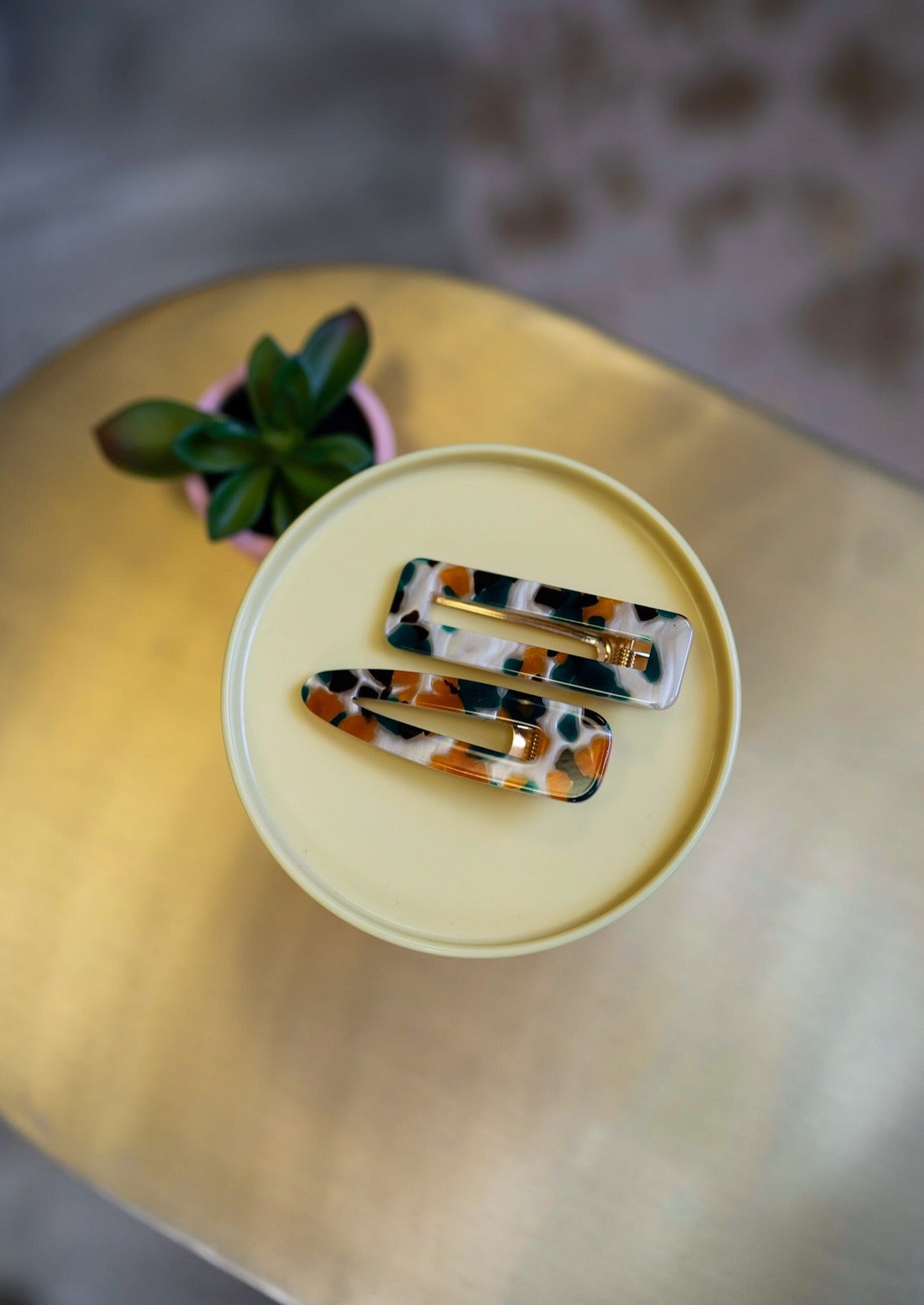 Elevate and add youth to any look with one of these sets. They look delicious together or worn individually and can be worn in so many ways! Each clip set comes with a matching pairs. One rectangle & one triangle.