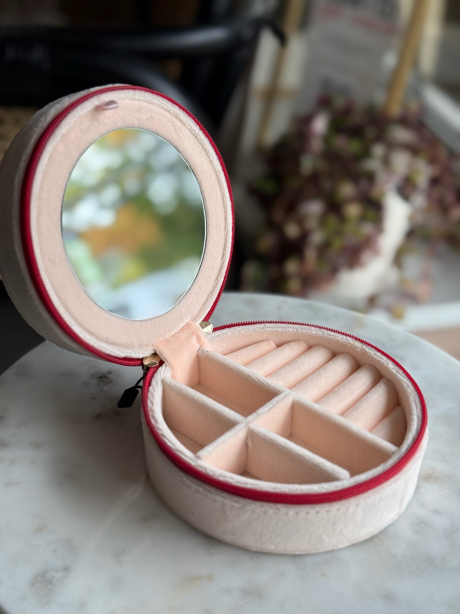 The perfect travel companion, Jewelry Zip Case, offers many hidden slots and compartments. Great for all jewelry- Rings, Earrings, Necklaces and bracelets. Made from super soft velvet and has a built-in mirror.