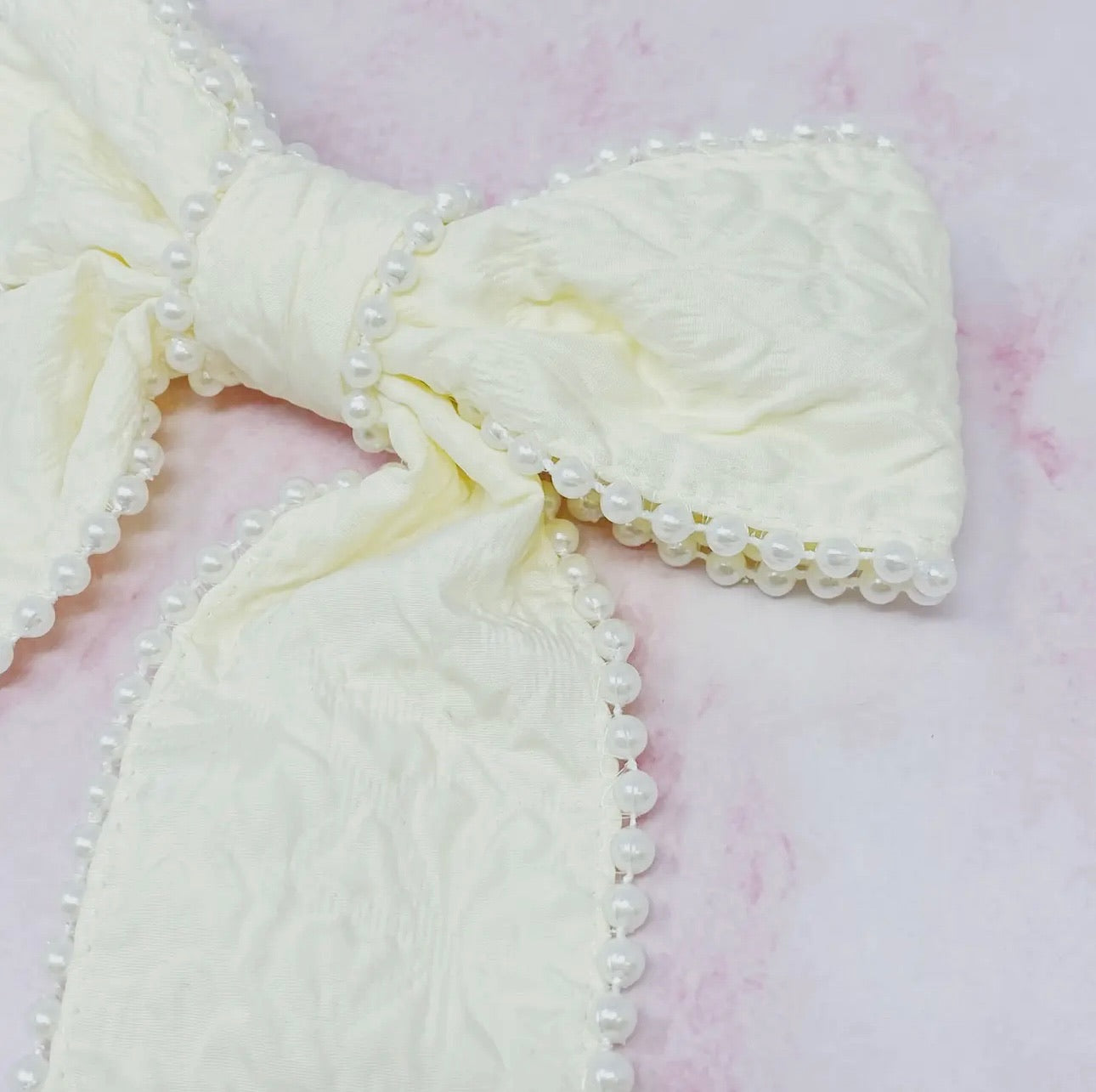 This Palace Pearl Embellished Hair Barrette is perfect for adding a touch of glamour to your look. Featuring a beautiful bow barrette with pearl embellishment all around, its exquisite embossed texture fabric and pearl details make it a stunning accessory for special occasions such as photo shoots, weddings, and more.